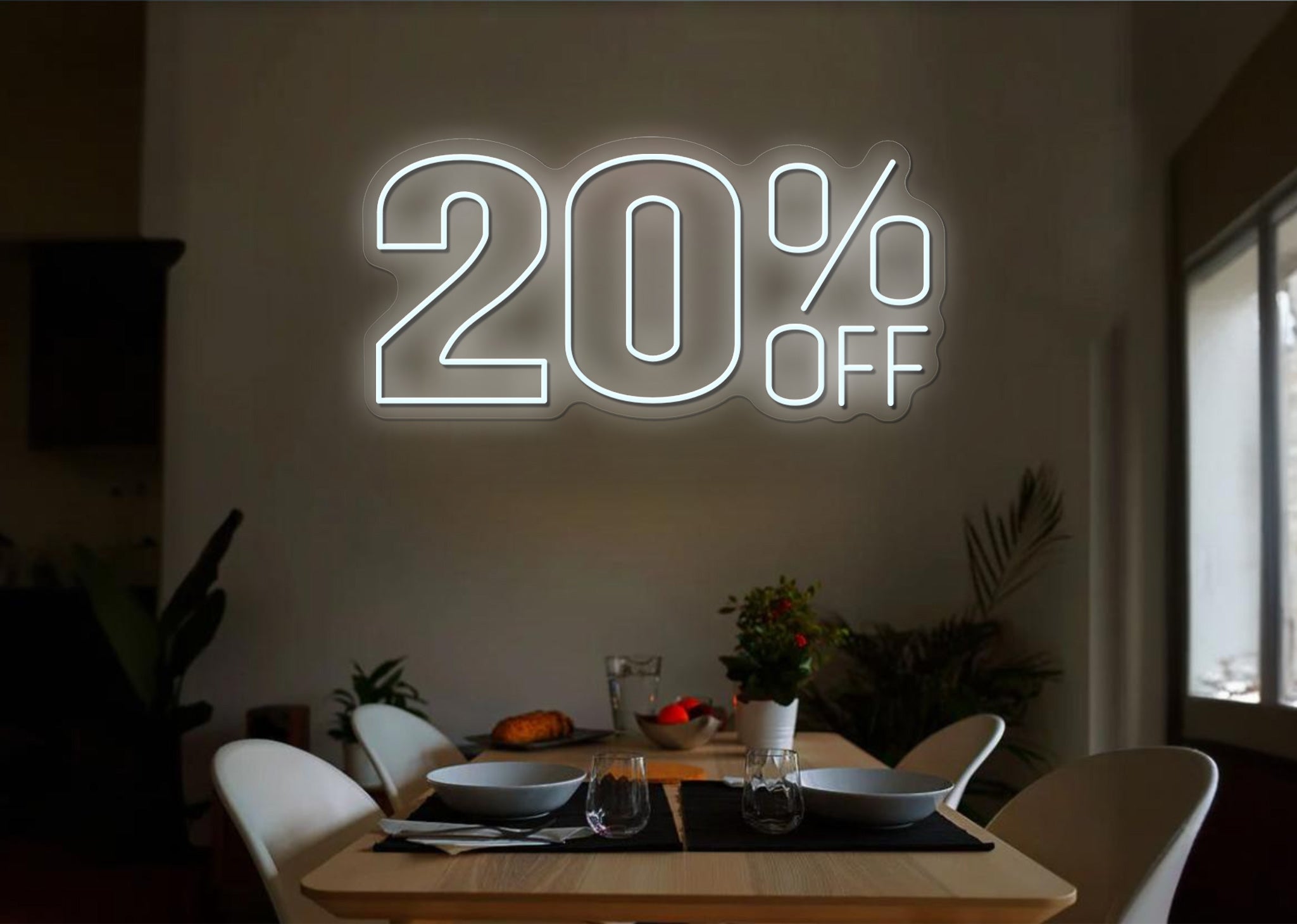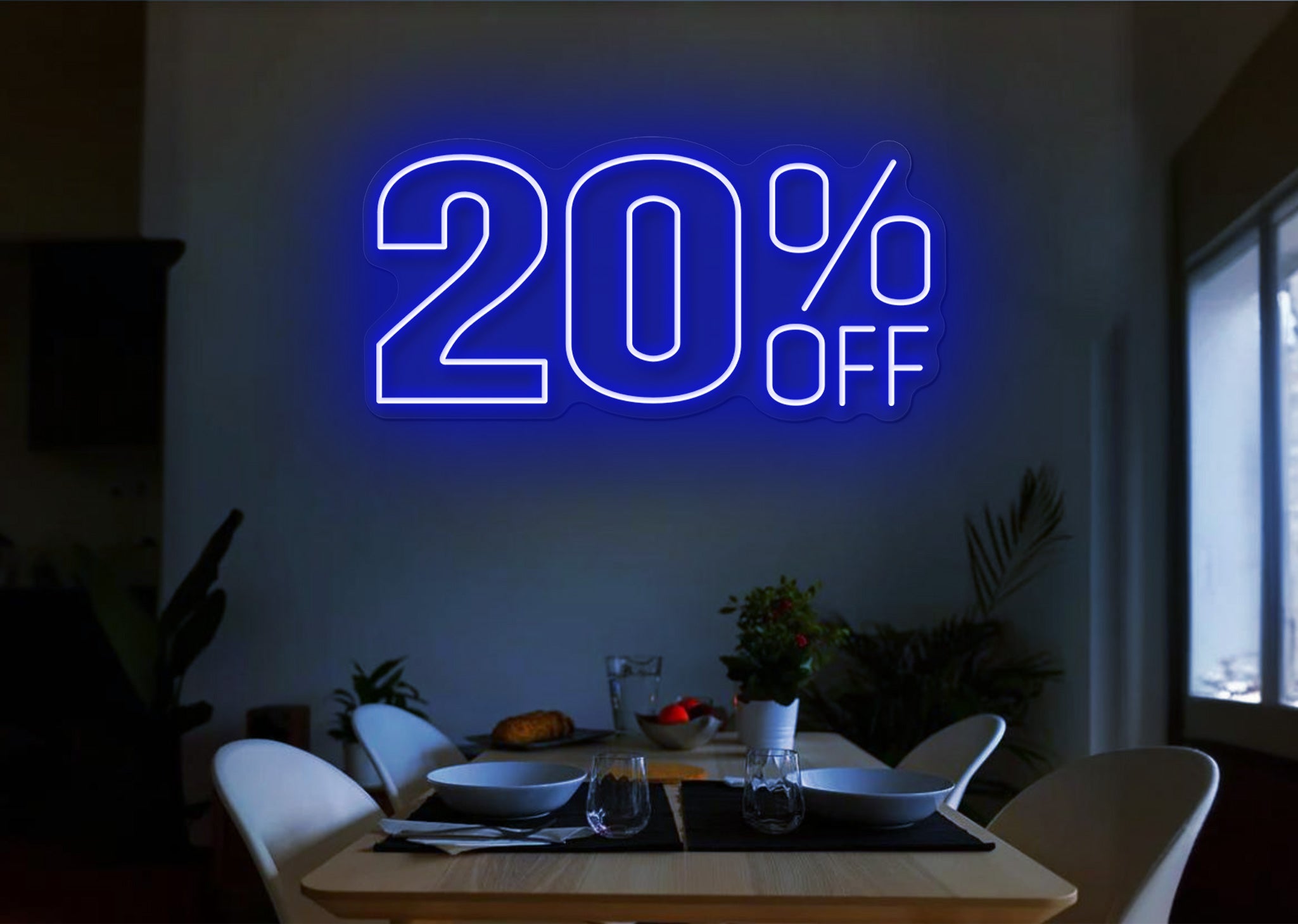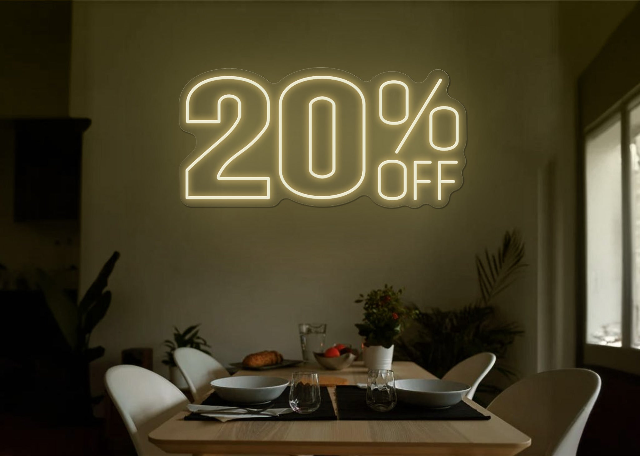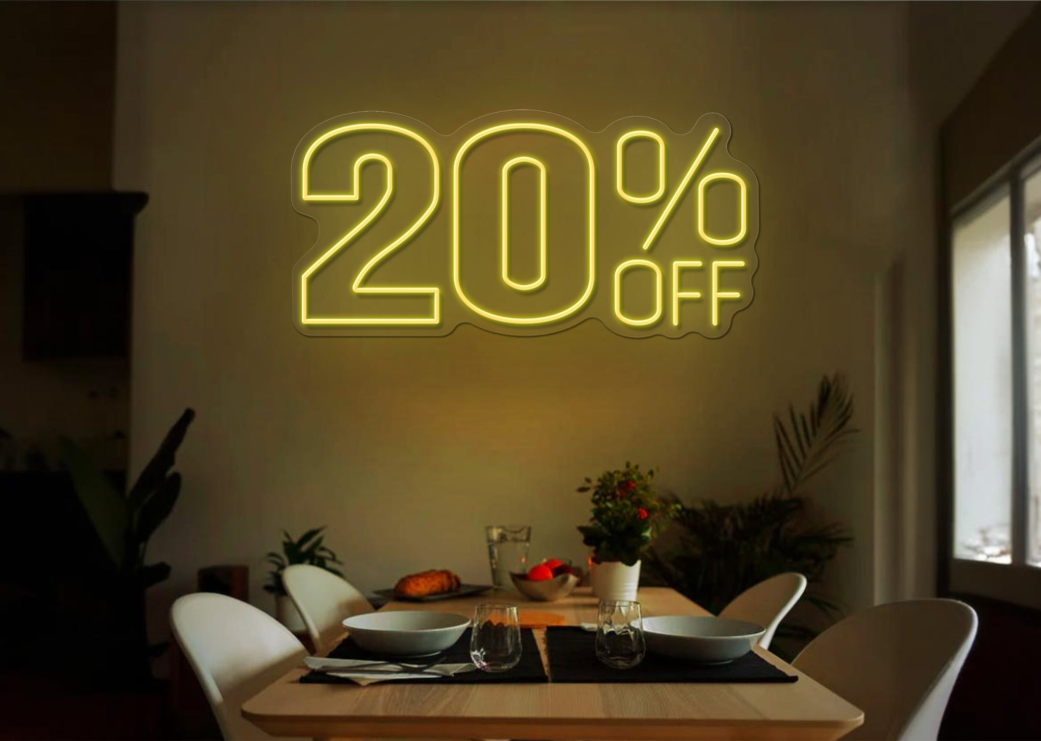 Draw customers in with the enticing "20% Off" LED Neon Sign—a must-have for any store, café, or retail space looking to boost visibility and celebrate sales in style. This vibrant neon sign casts a bright, energy-efficient glow, capturing attention and enhancing your space with a fun, modern touch. Perfect for pop-up shops, seasonal promotions, or exclusive events, the "20% Off" LED Neon Sign is designed to communicate your discount with maximum impact.