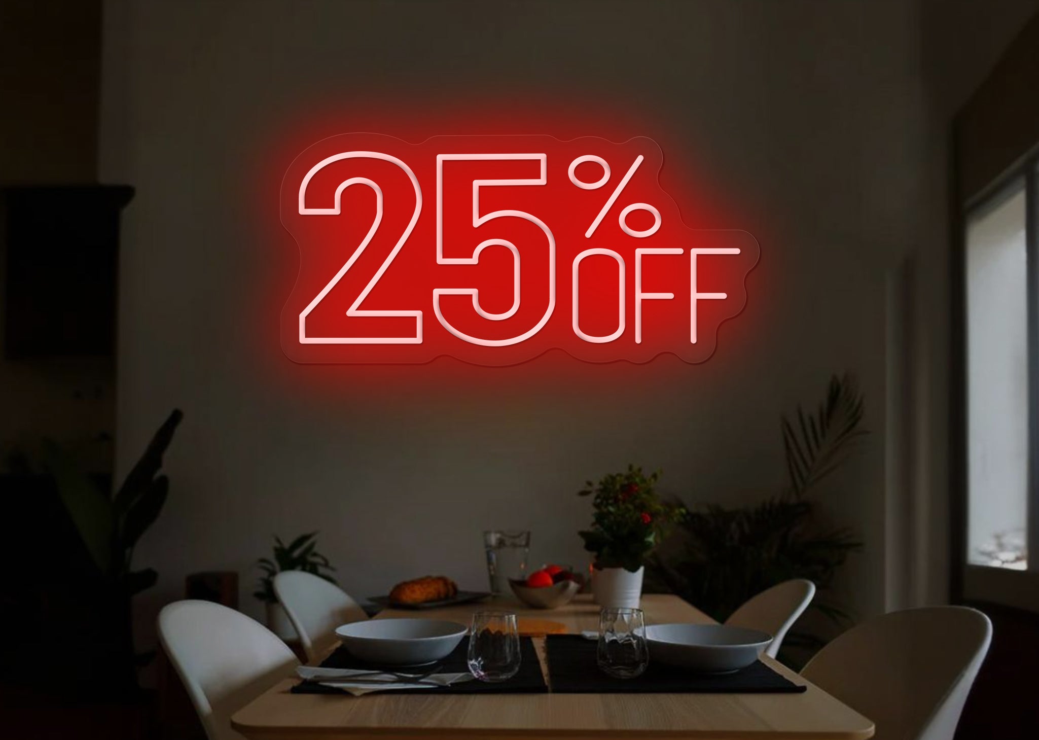 Designed for easy installation, the "25% Off" LED Neon Sign adds an instant promotional boost to your shop window, display area, or sales section. Its durable construction ensures it withstands daily use, and its low energy consumption makes it perfect for extended display hours. Make your promotions pop with the "25% Off" LED Neon Sign—an ideal way to bring customers in and transform your sales event into a highlight.