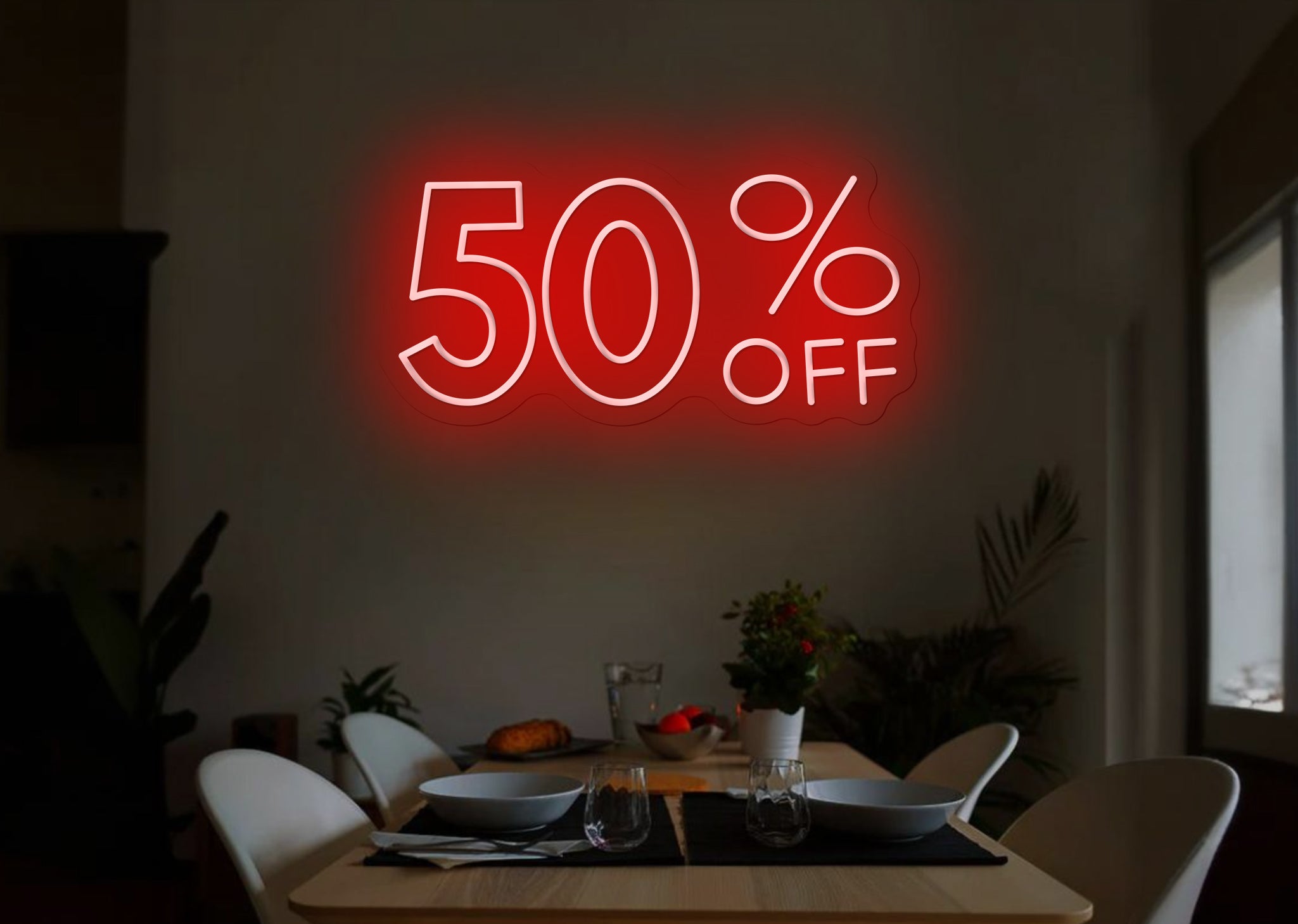Easy to install and versatile, this "50% Off" LED sign can enhance storefront windows, point-of-sale areas, or promotional displays, creating an inviting atmosphere that encourages impulse shopping and drives sales. Ideal for pop-ups, retail spaces, and boutique shops, this neon sign is both stylish and functional, adding a modern edge to your décor. Make every sale a success by adding this powerful marketing tool to your space and ensuring that your deals truly shine.