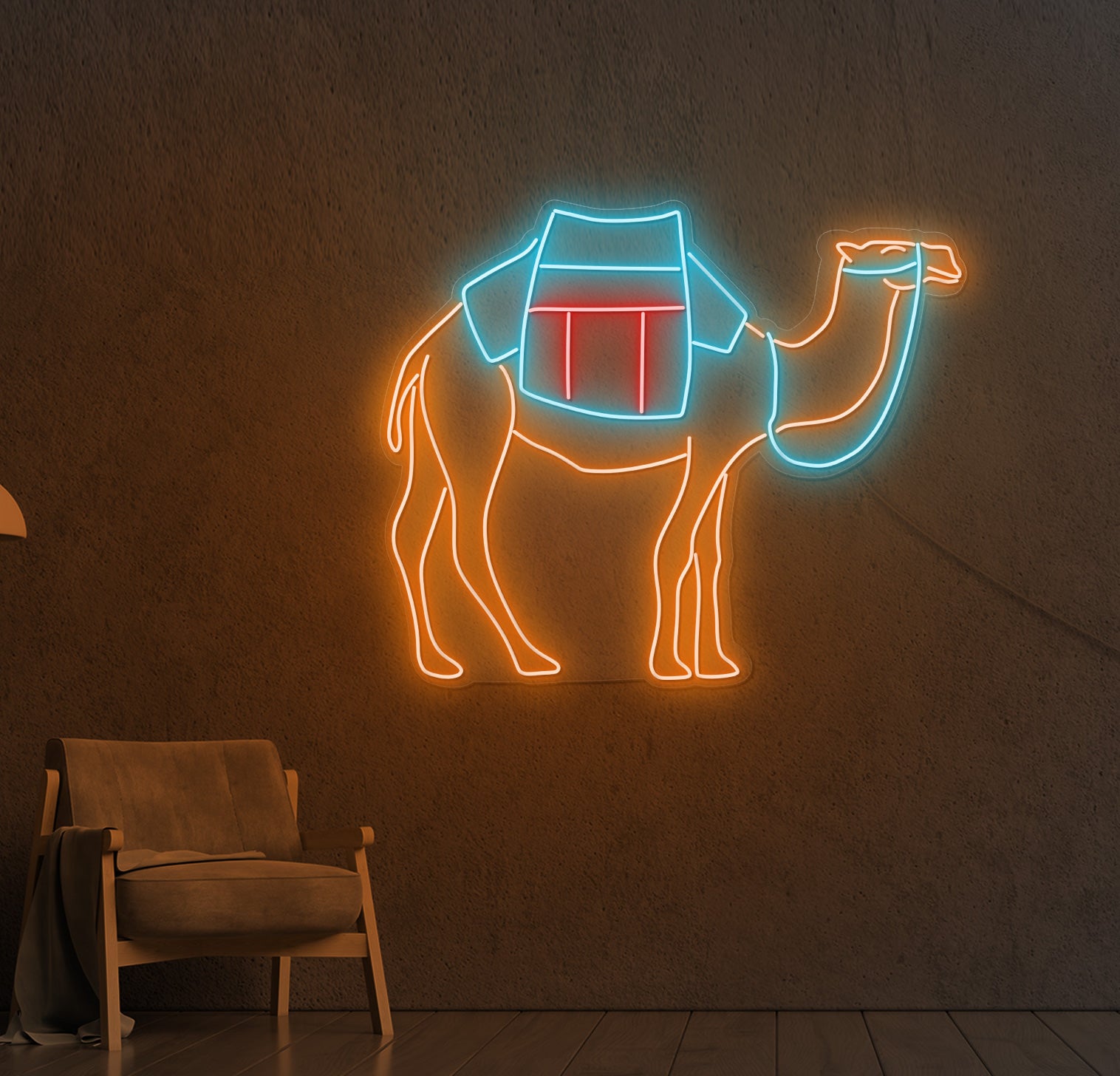 Quench your thirst for unique decor with our "Thirsty Camel LED Neon Sign"! This eye-catching sign features the silhouette of a camel, captured mid-stride, with vibrant LED neon lights illuminating its outline.