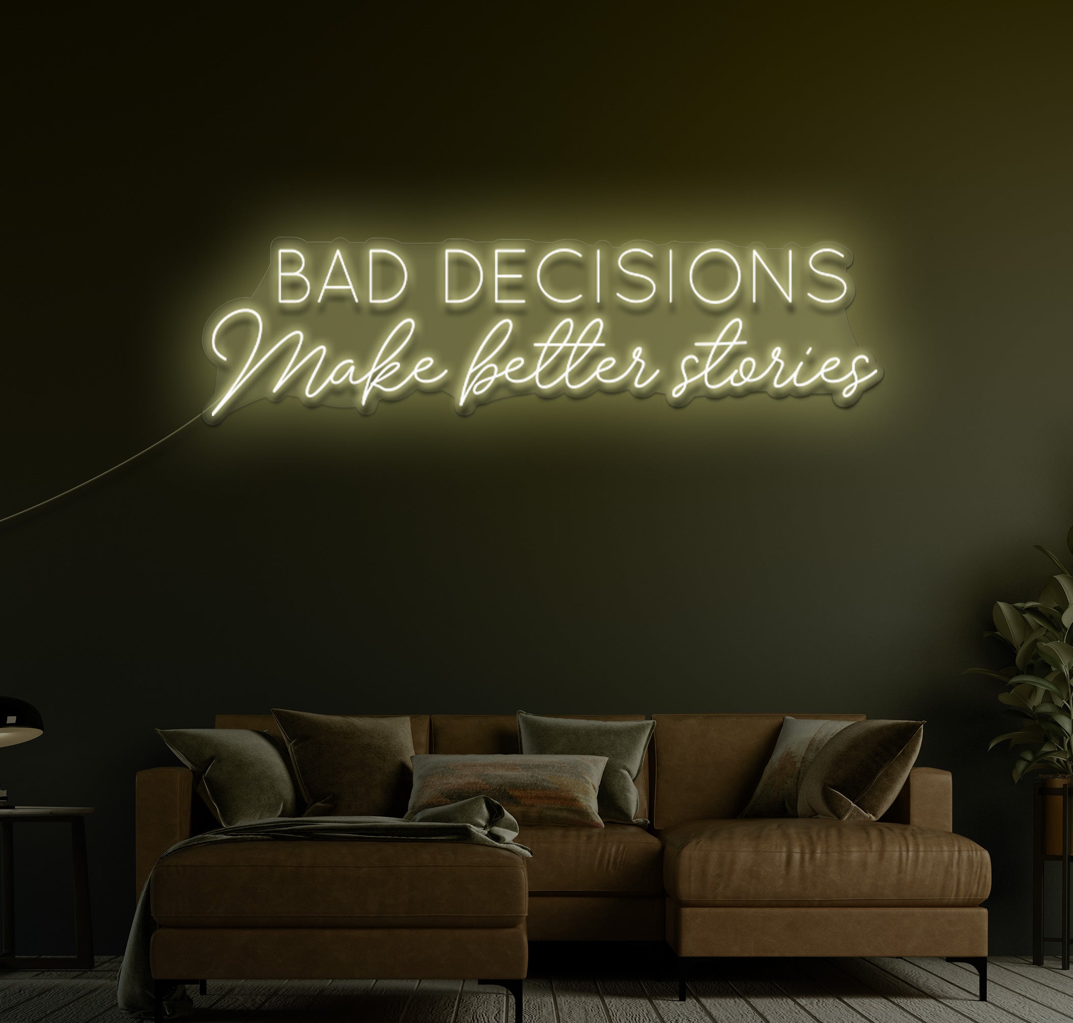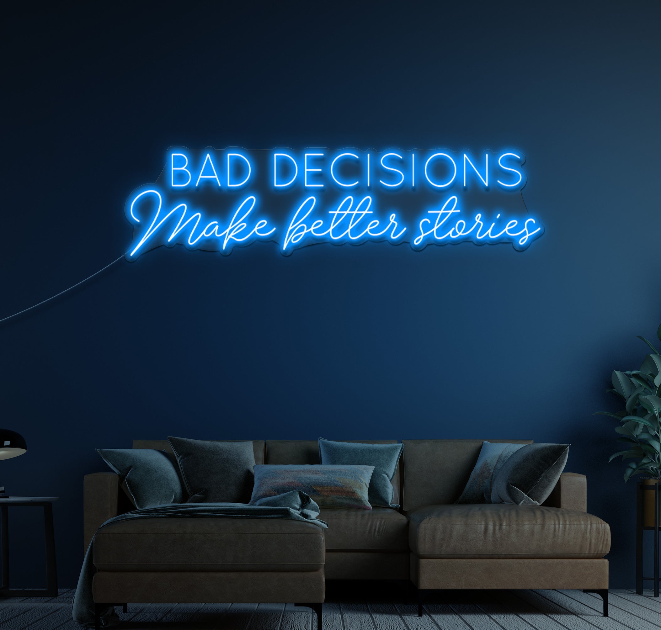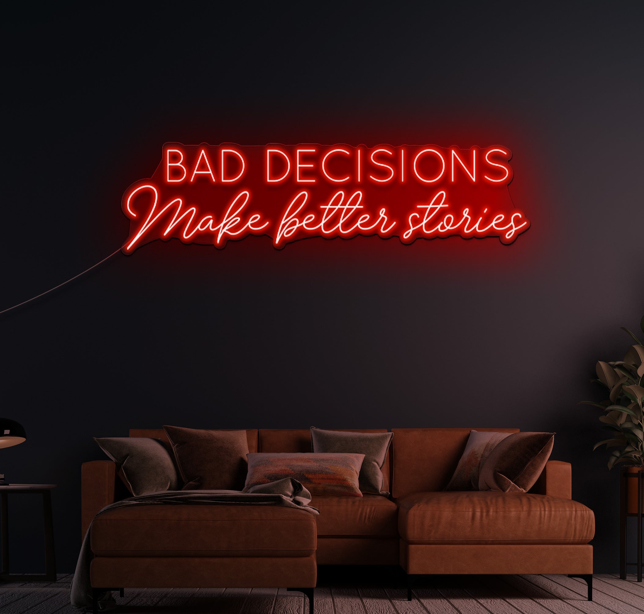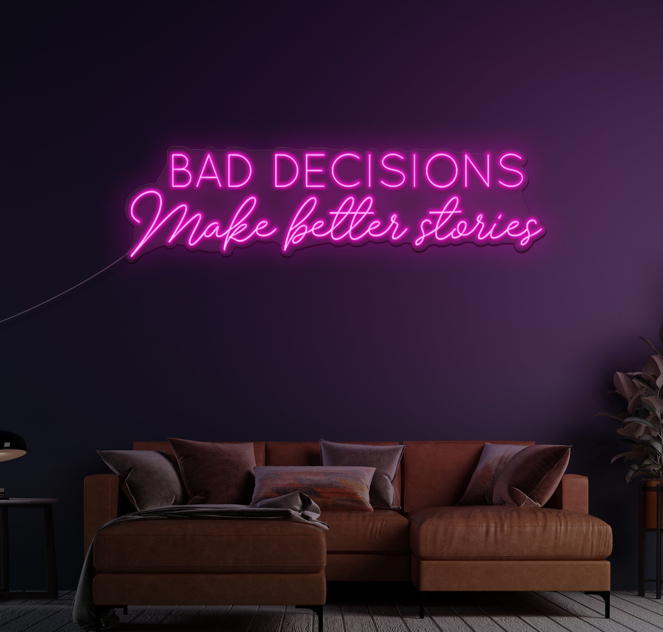 Whether you're celebrating a birthday, wedding, or just a night out with friends, the "Bad Decisions Make Better Stories" LED Neon Sign is sure to add a touch of humour and personality to your event. Get ready to make some unforgettable memories and share some laughs with this playful and stylish sign.