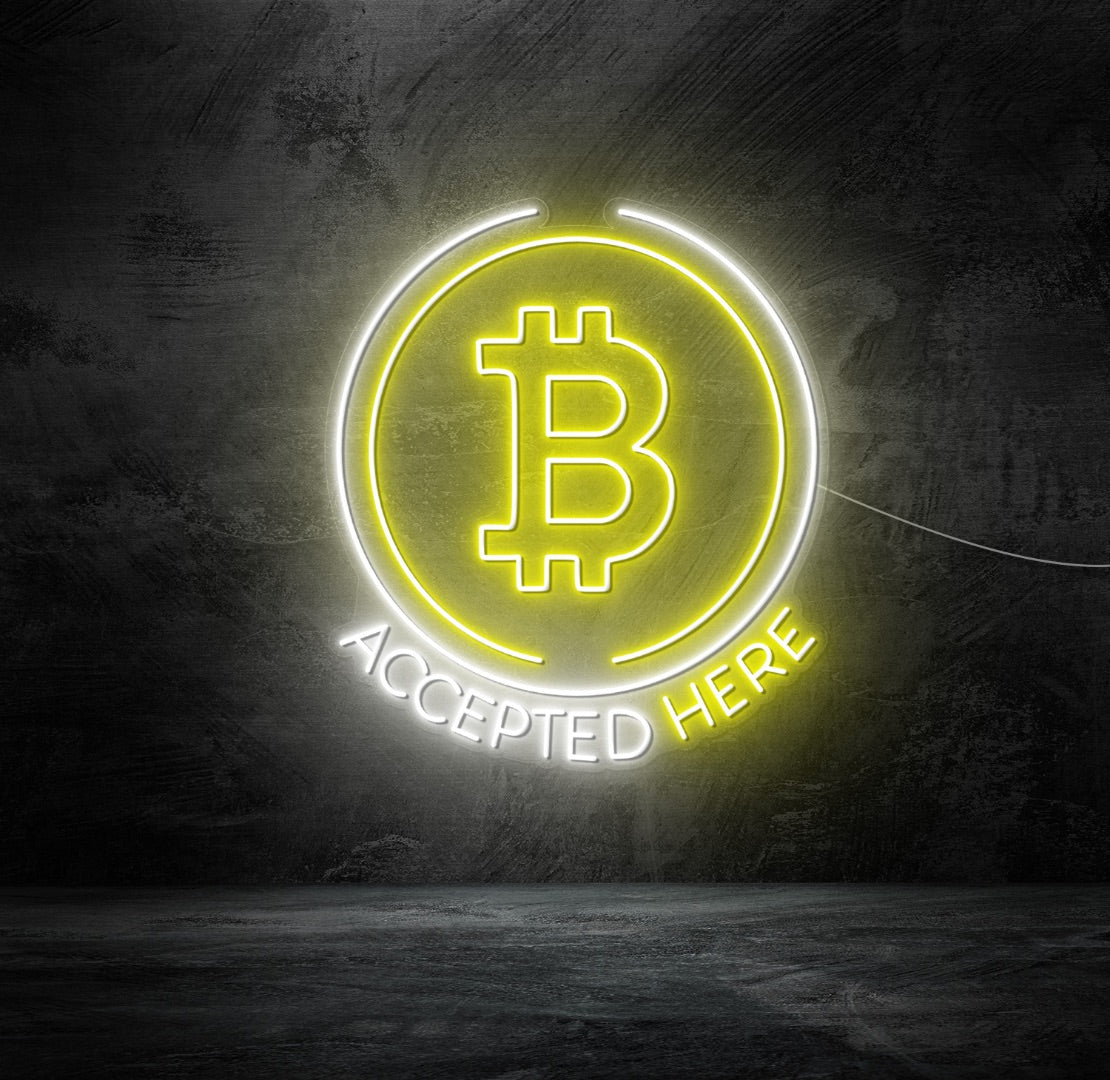 The neon art for Bitcoin Accepted Here is ideal for that purpose and it also adds a nice touch of style to the place. Always think about this sign as the perfect way to incorporate bitcoin into your store.