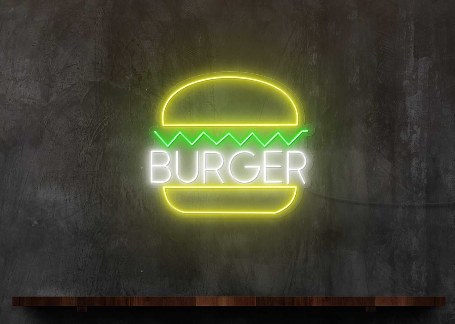 The inviting glow of 'Burger' sets the perfect atmosphere for casual dining and food-centric celebrations. Create a warm, welcoming environment that entices customers to step in and savour the flavours of your delectable burgers. It's not just a sign; it's a marketing tool that enhances your brand image and leaves a lasting impression.