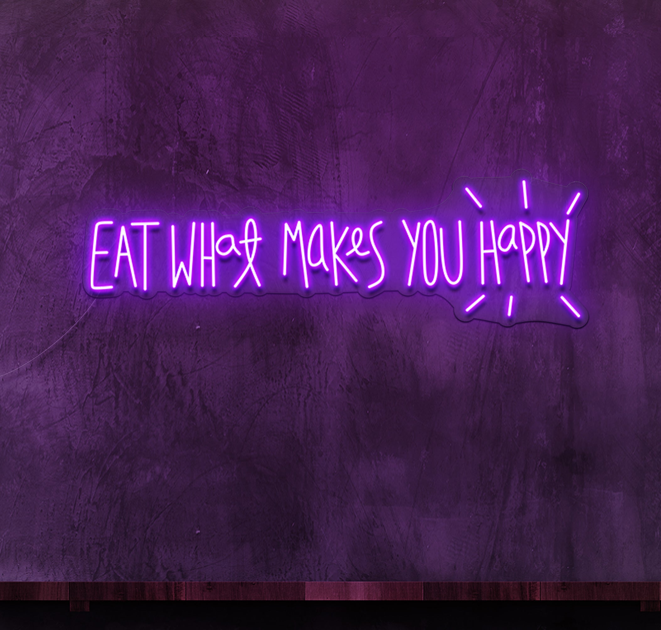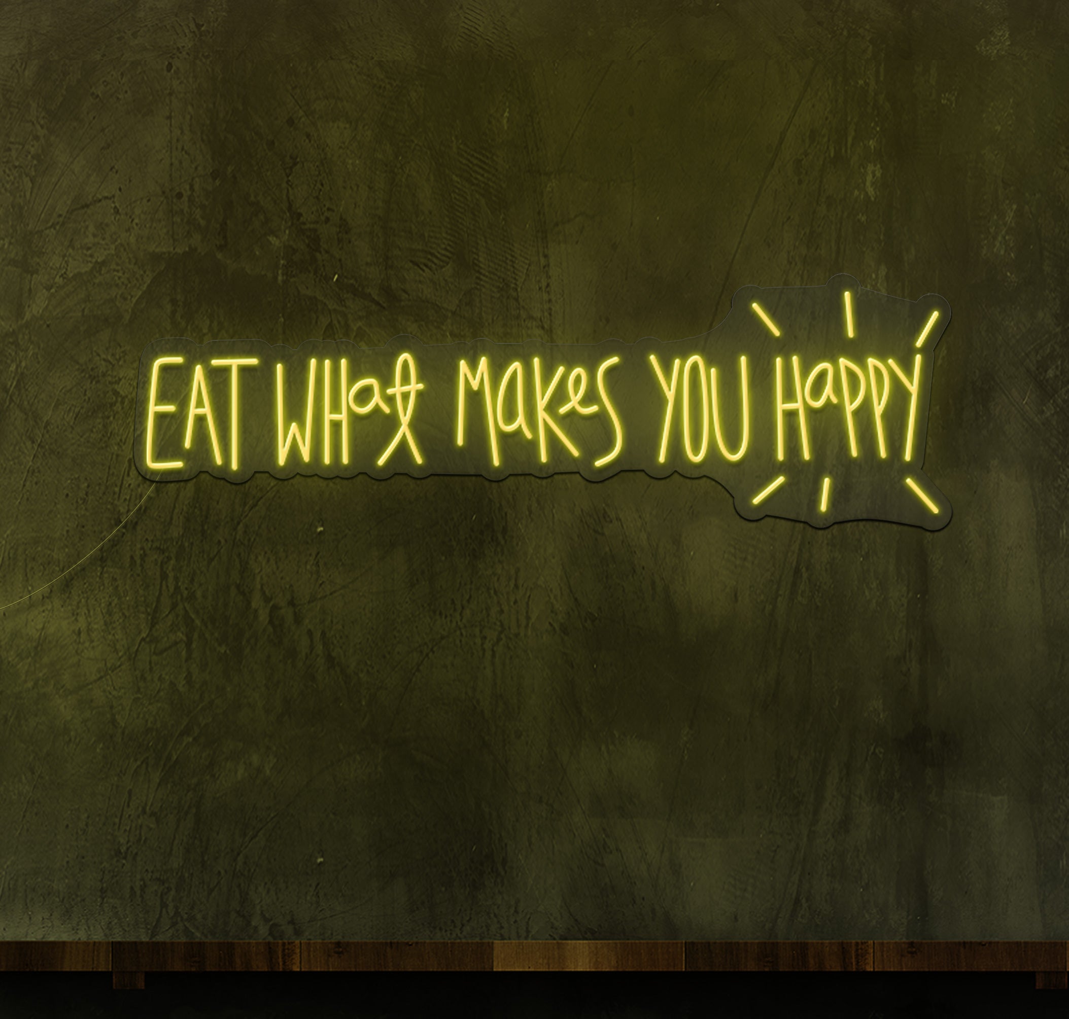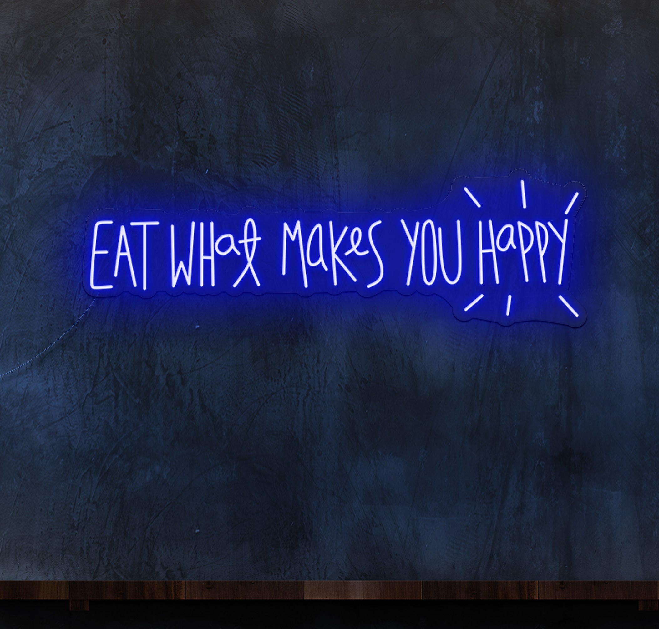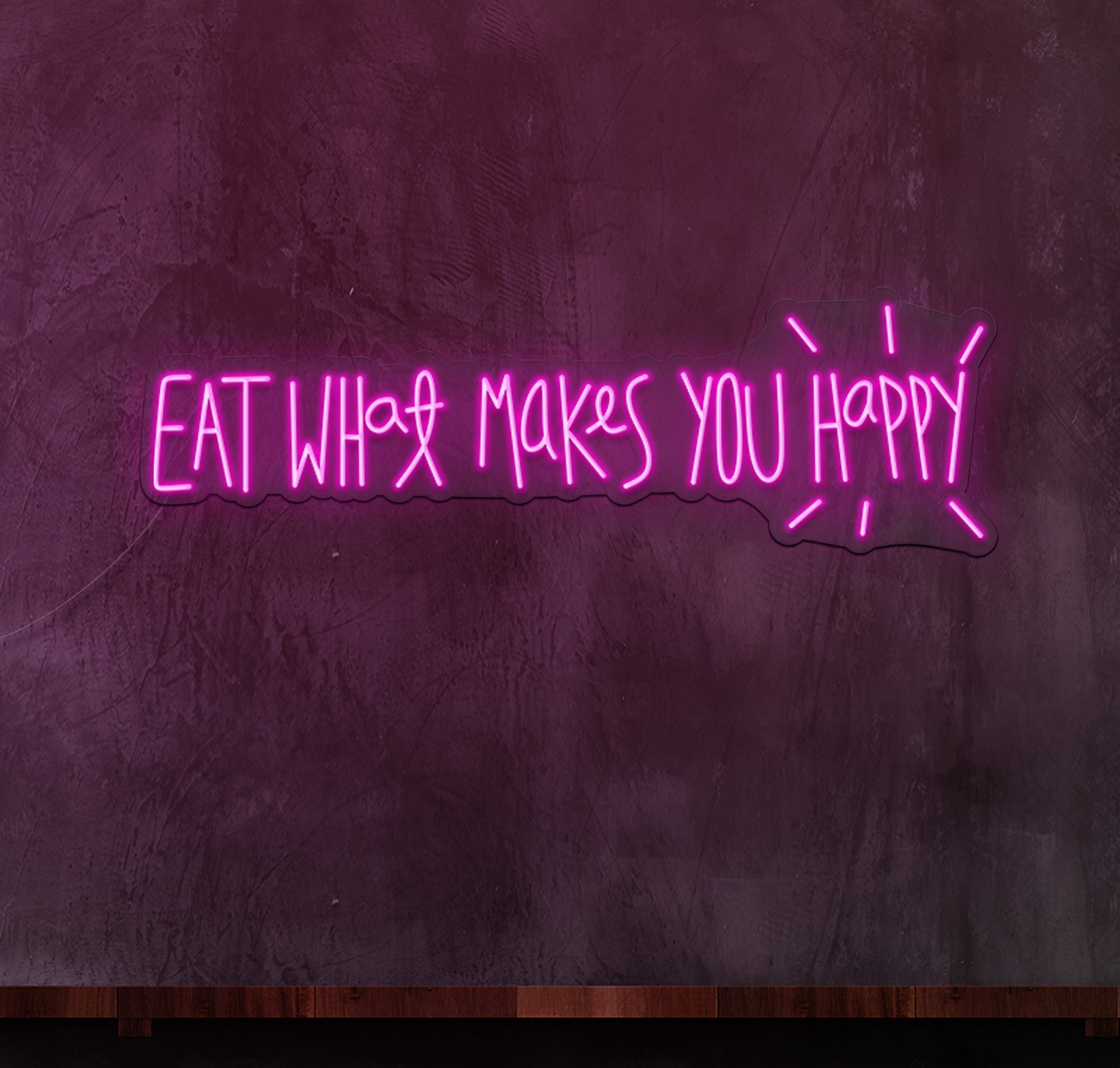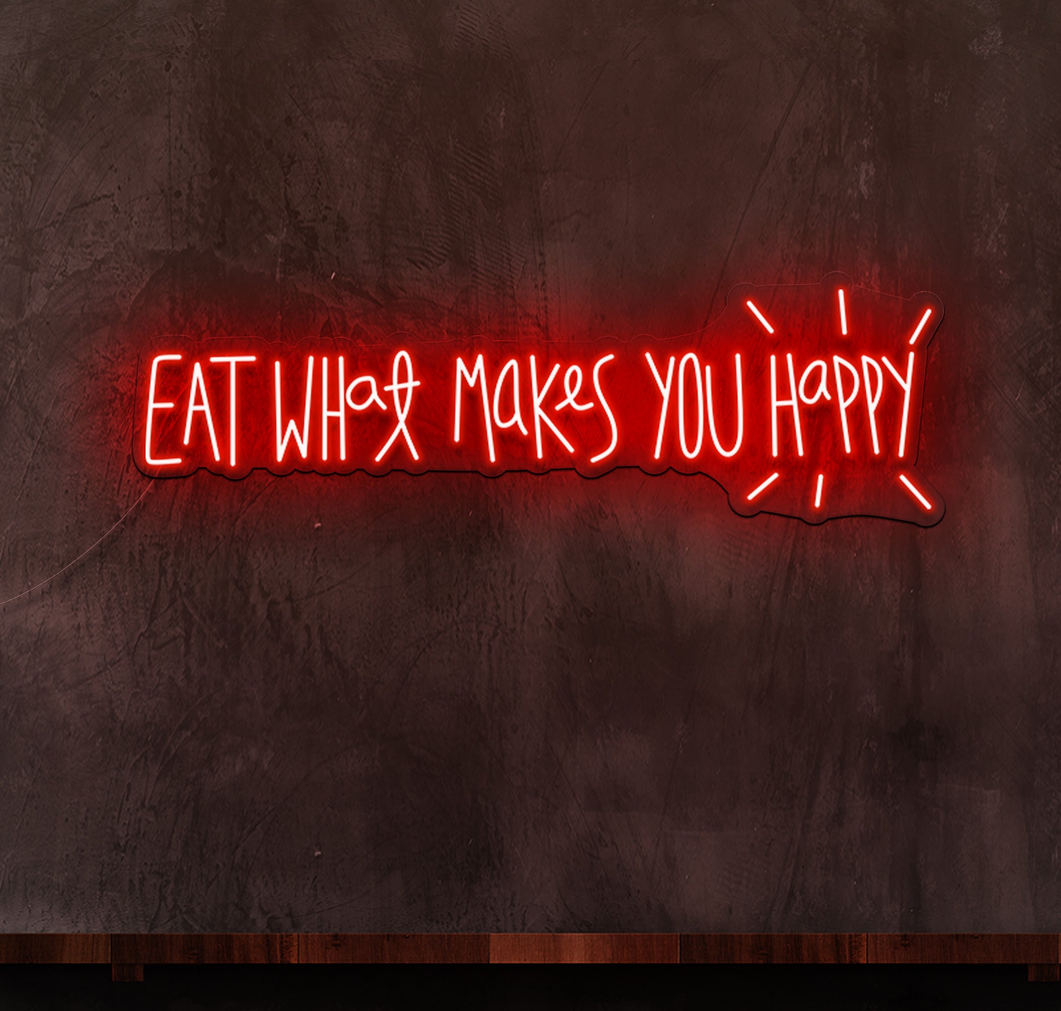 Whether you're hosting a dinner party, cooking up your favourite meal, or simply enjoying a snack, this sign serves as a reminder to prioritise happiness and enjoyment in every bite. Add a touch of fun and positivity to your home with the "Eat What Makes You Happy" LED Neon Sign.