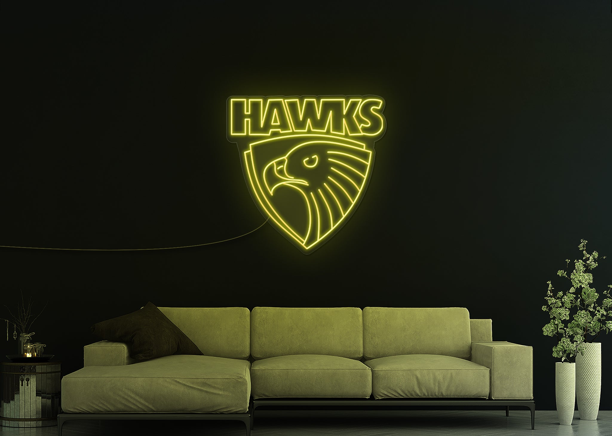 Illuminate your space with the unmistakable pride of the Hawthorn Football Club using the "Hawks LED Neon Sign". Showcasing the iconic Hawks logo in vibrant LED lighting, this sign brings the spirit of AFL to life in any room. Crafted with durable materials and energy-efficient LED technology, it ensures long-lasting brightness and efficiency.