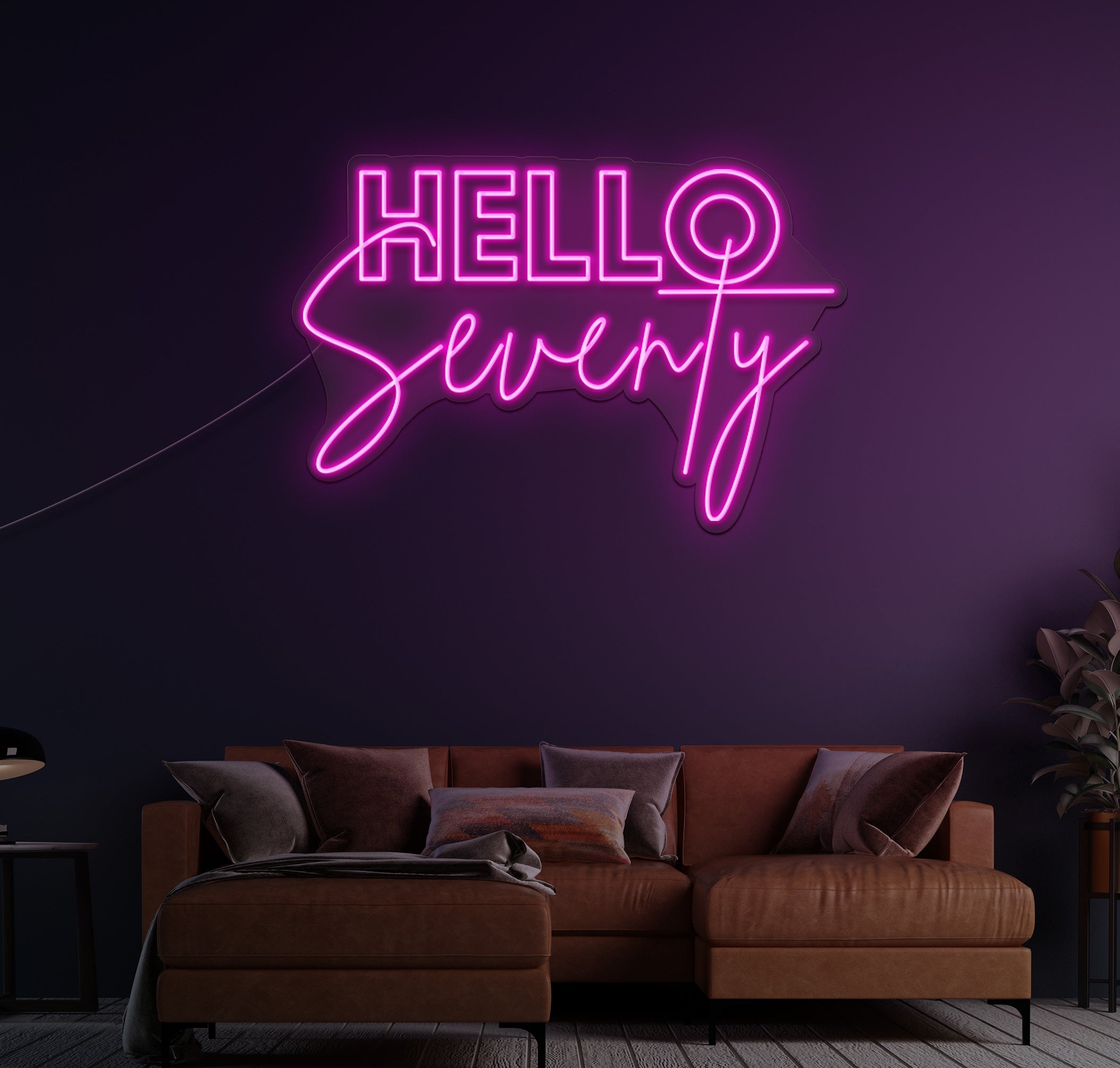 Crafted with high-quality LED lights, the "Hello Seventy" sign emits a vibrant and colourful glow that instantly brightens up any space. Its sleek design and modern font make it a standout decor piece that will impress your guests and create a memorable atmosphere.
