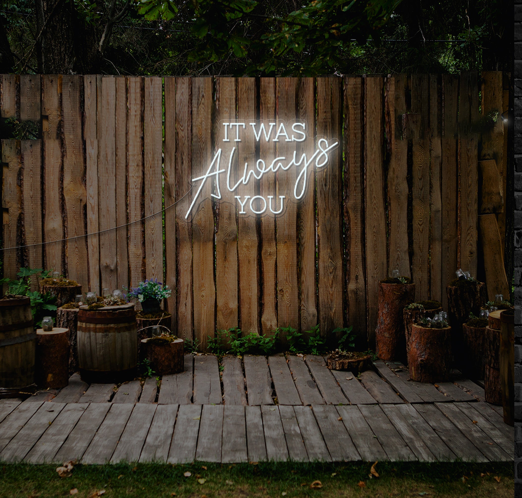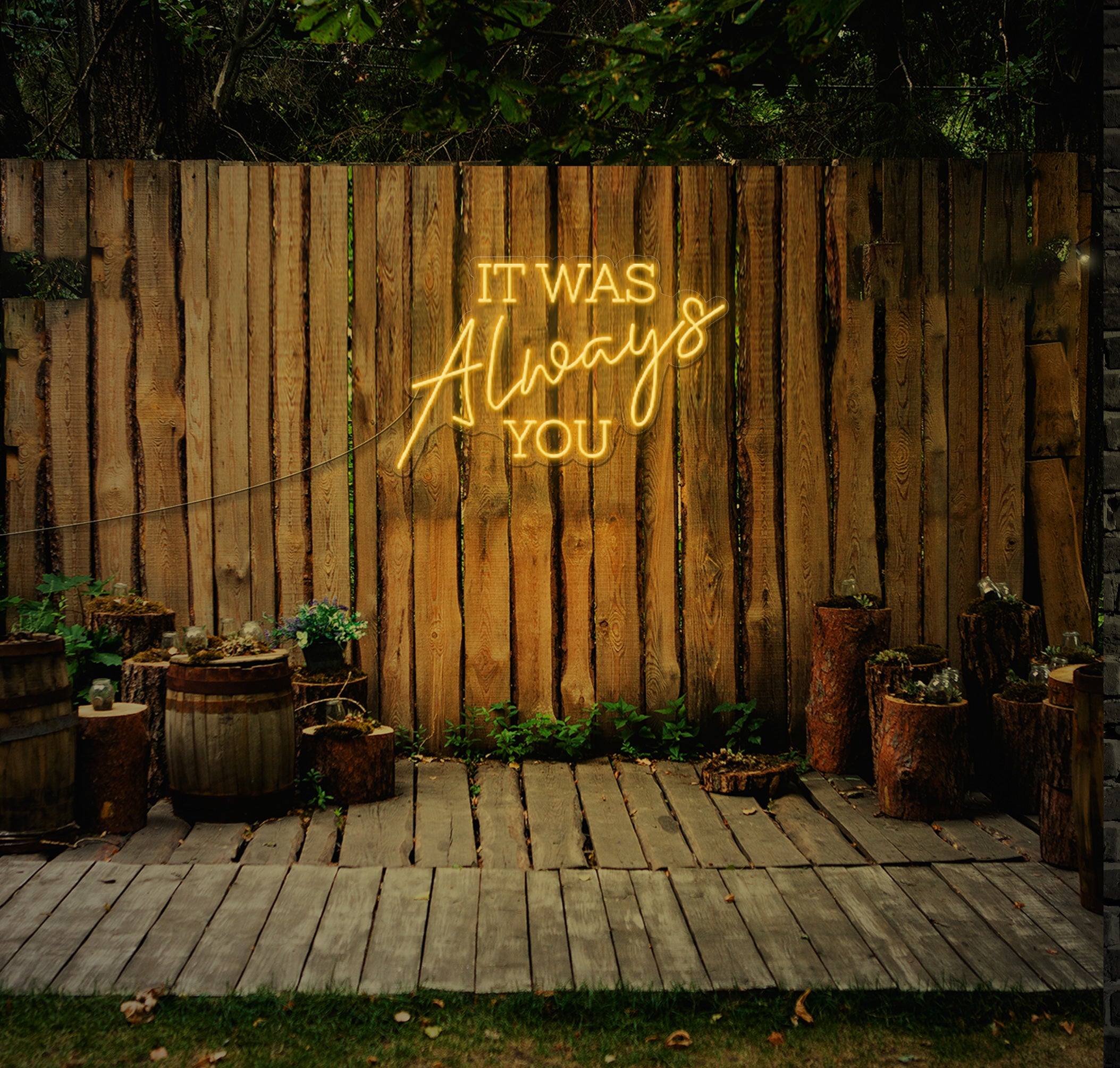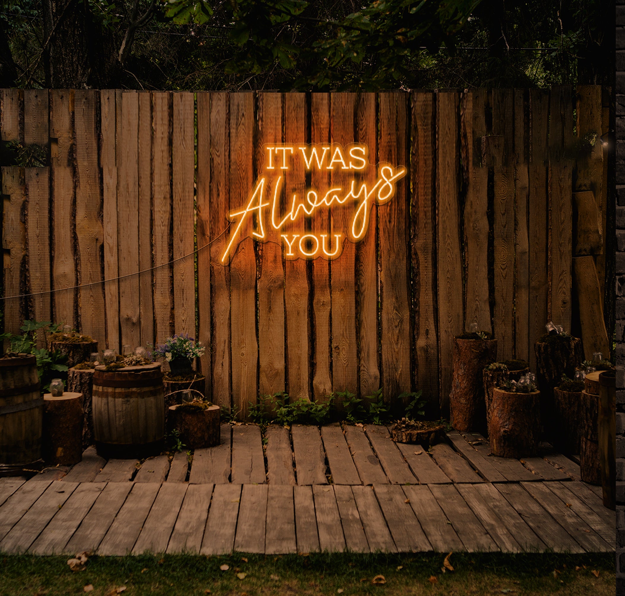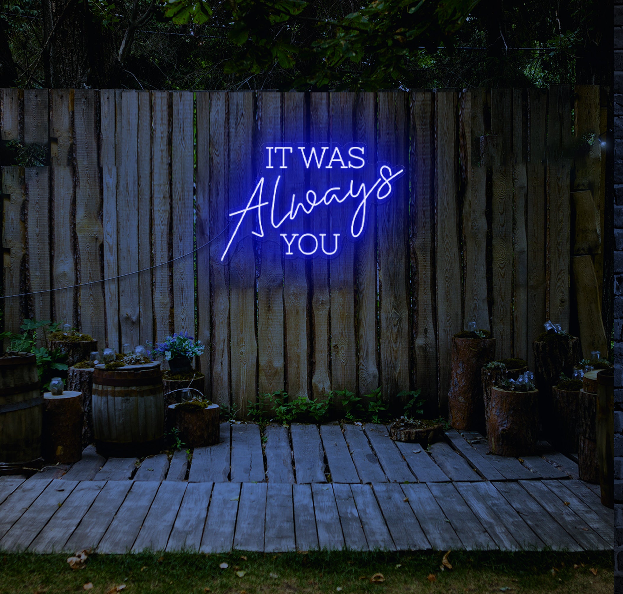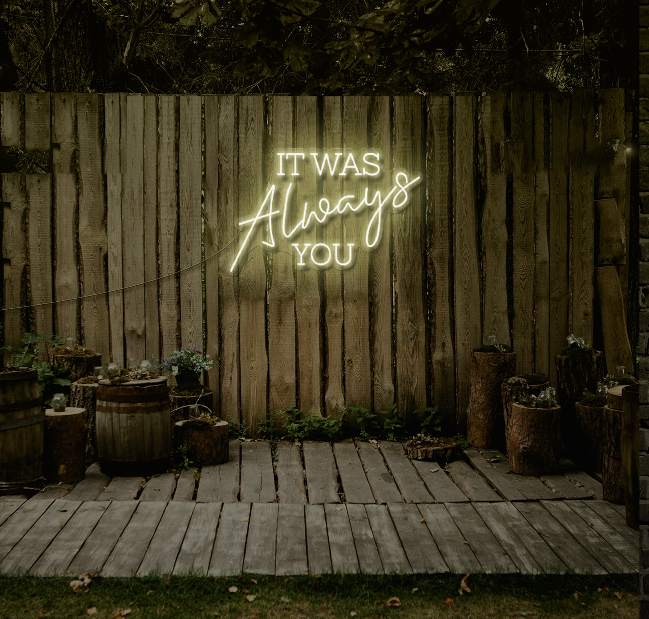 Fully customisable, you can select your preferred colours and sizes to seamlessly integrate the "IT WAS Always YOU" LED Neon Sign into your wedding theme and ambiance. Whether you're exchanging vows in a rustic barn, scenic garden, or contemporary venue, this radiant addition will captivate your guests and create an unforgettable atmosphere filled with love and admiration.