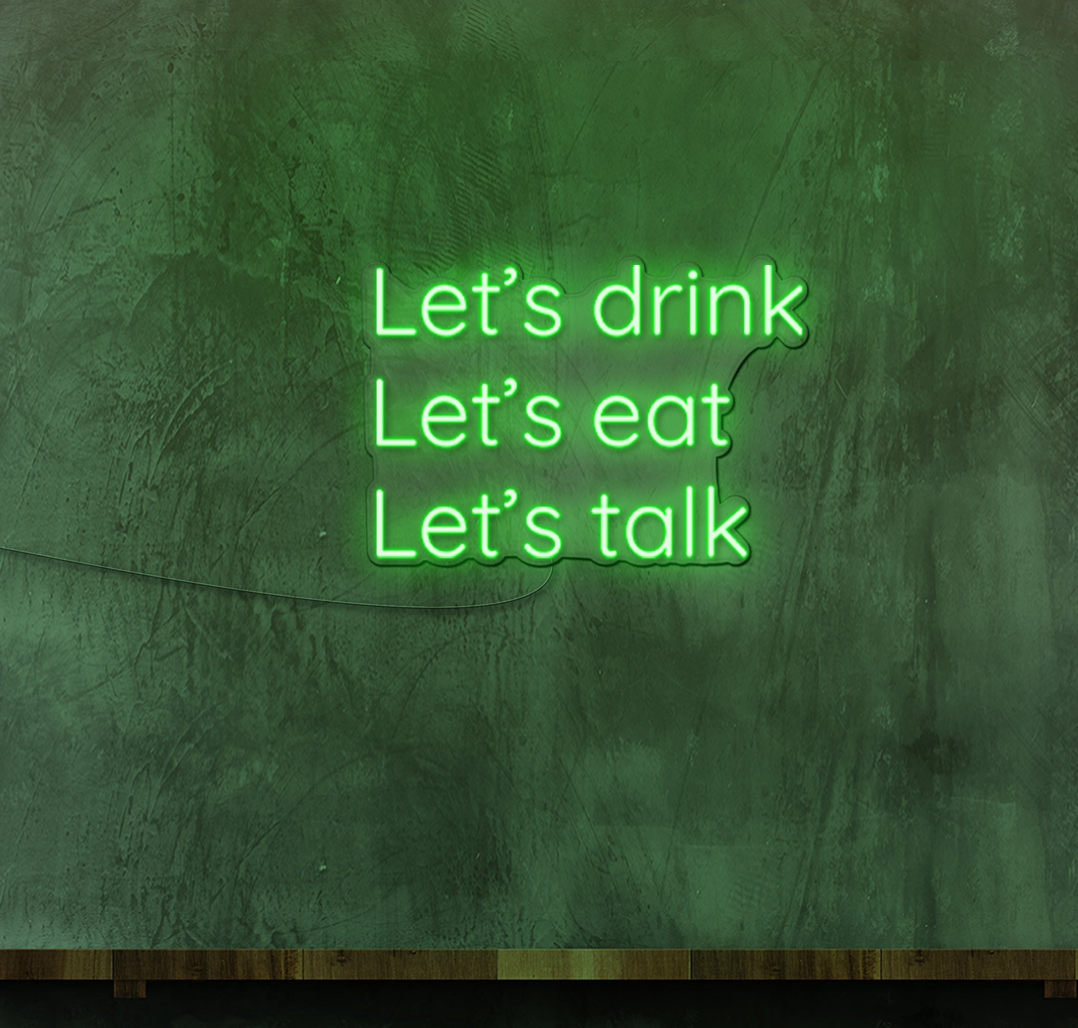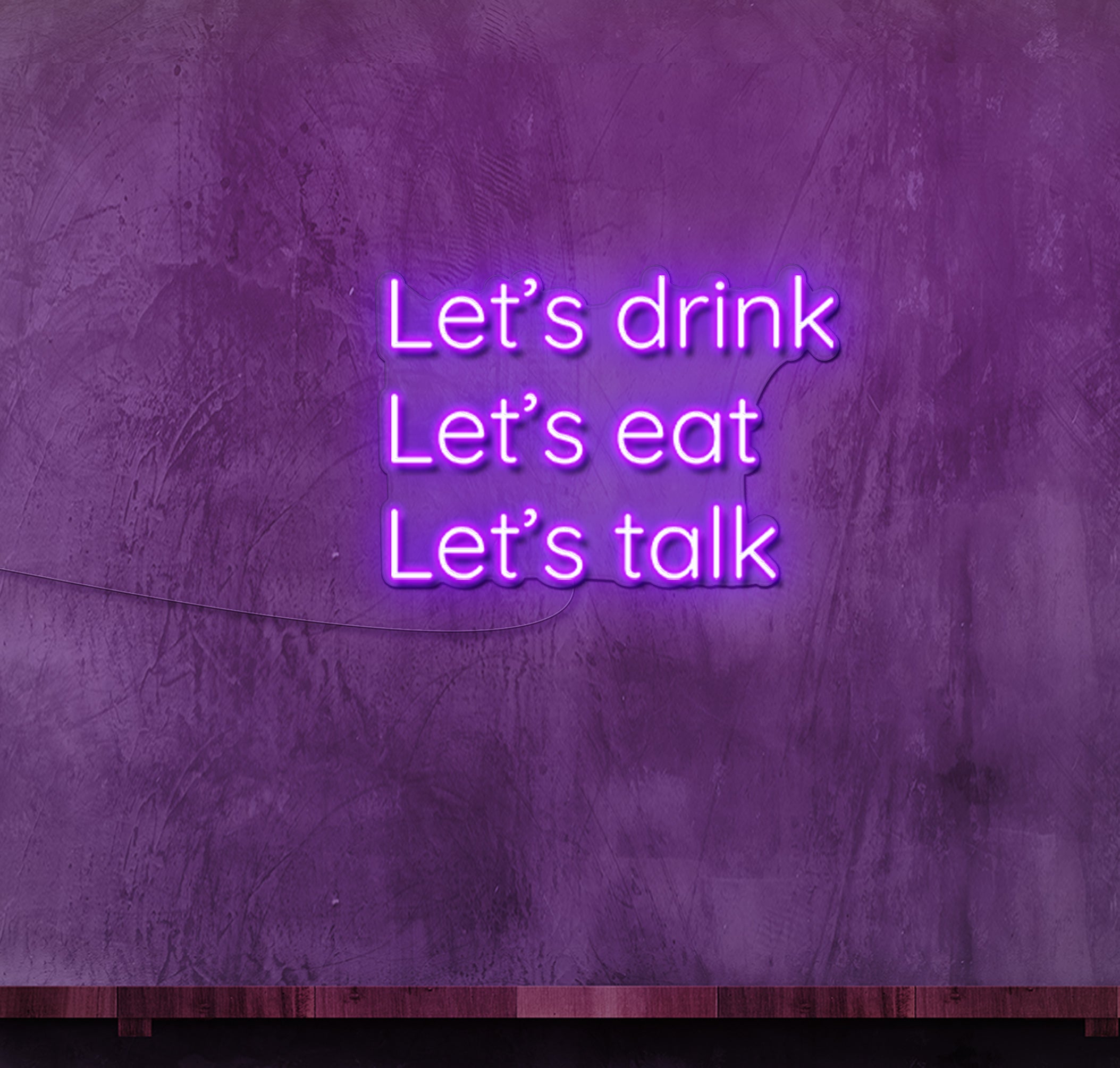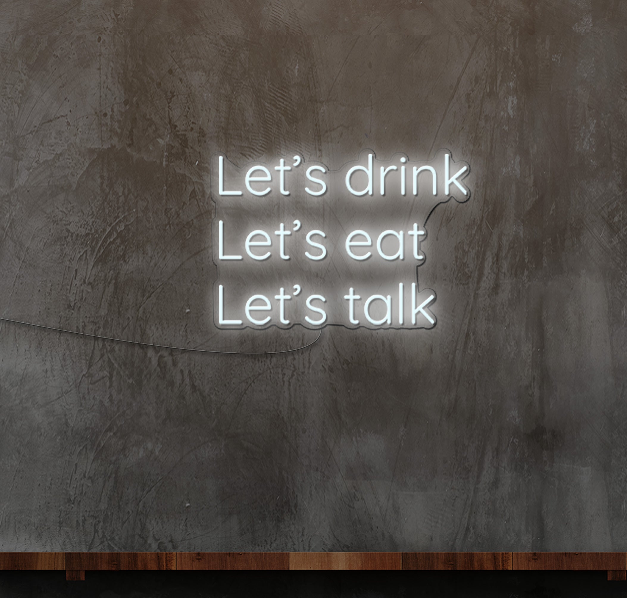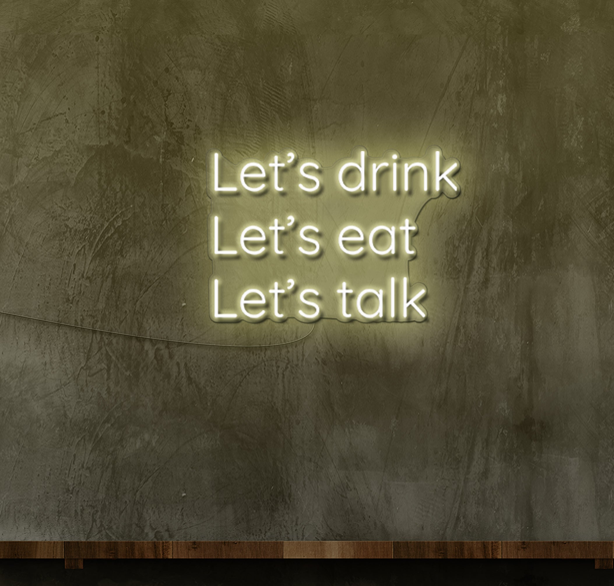 Enhance the inviting atmosphere of your food establishment with our captivating "Let's Drink, Let's Eat, Let's Talk" LED neon sign. This vibrant sign combines bold typography with vivid colours to create an eye-catching focal point that beckons customers to indulge in culinary delights and engaging conversation.
