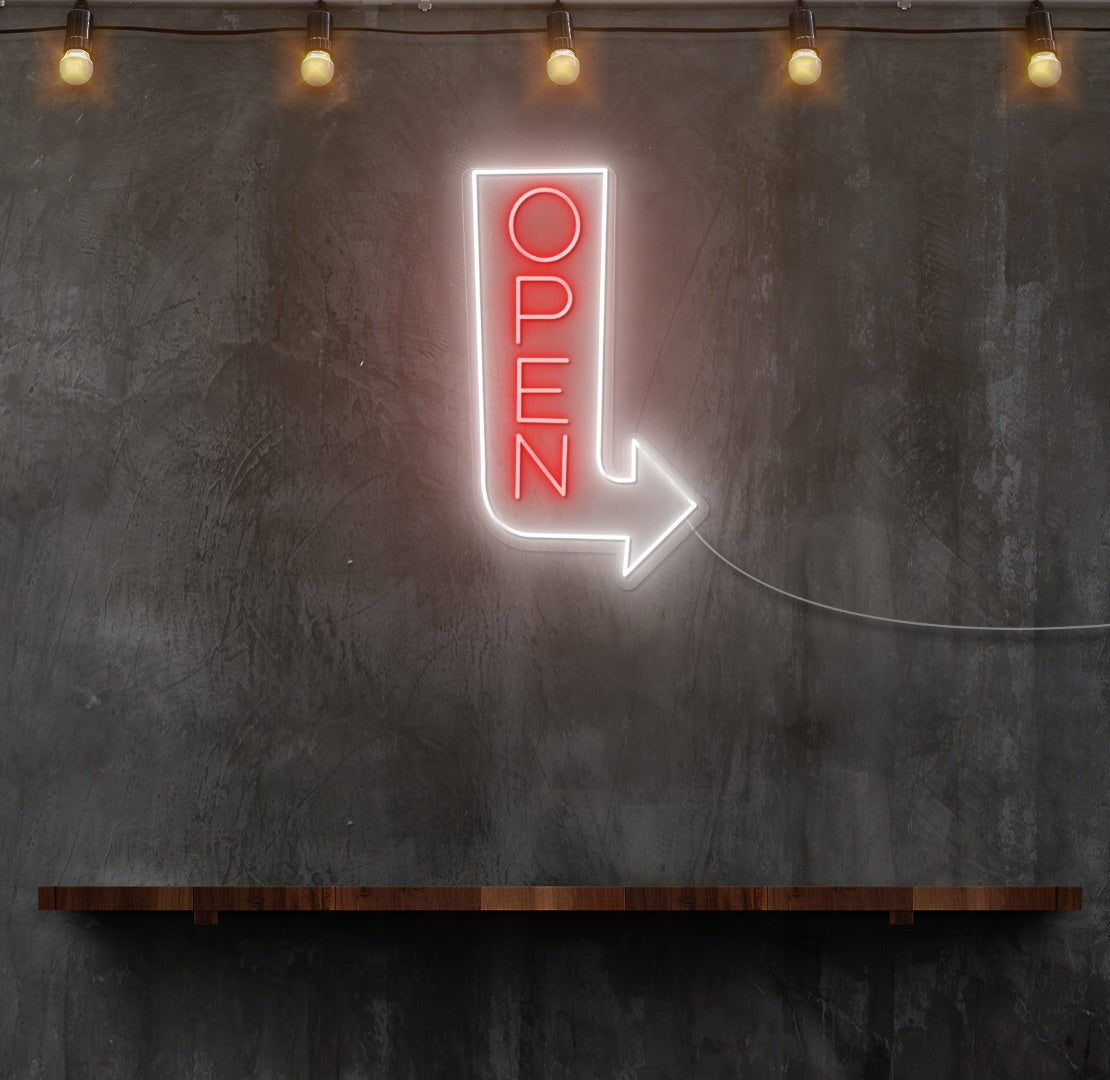 Direct attention with style using the Open Arrow neon sign. This customisable neon light combines the classic Open sign with a directional arrow, creating a visually striking and functional display. Hang it in your storefront, entrance, or business space, and let the Open Arrow neon sign become a commanding and purposeful feature.