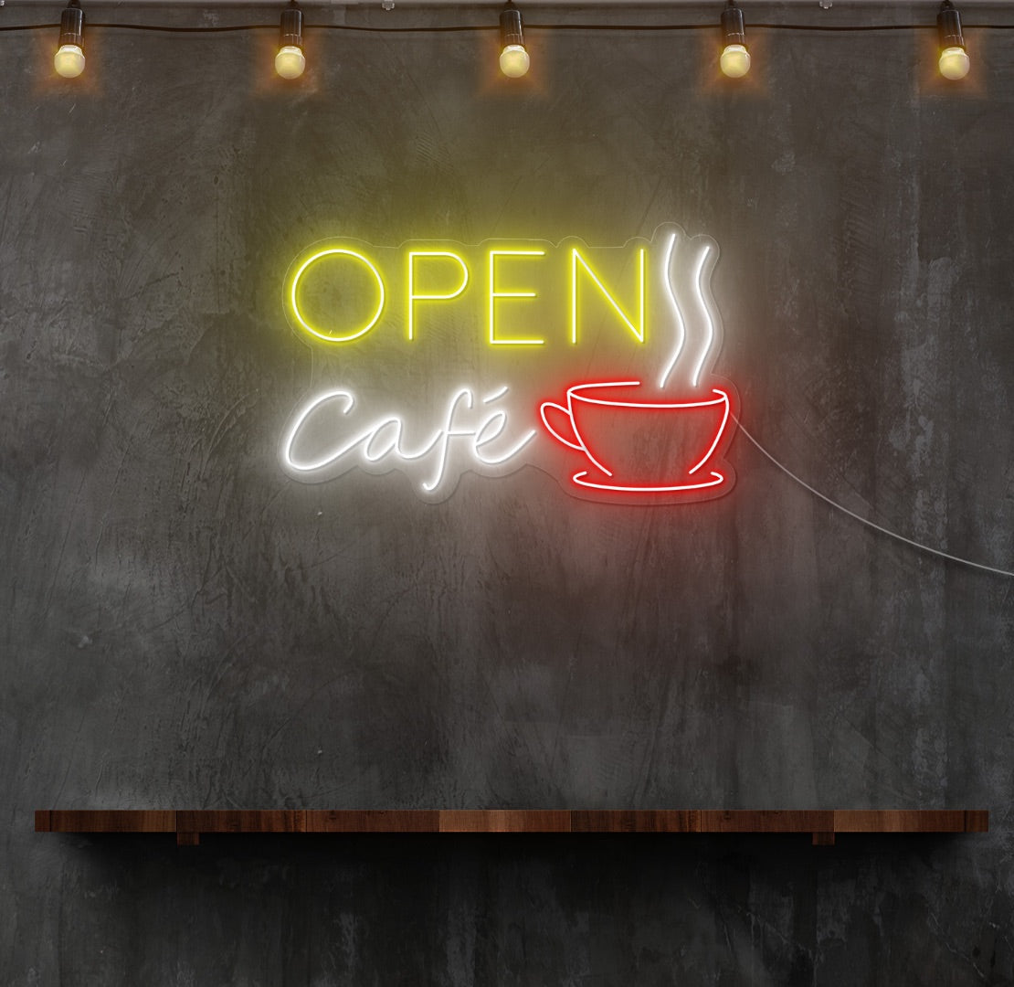 Welcome patrons with the inviting glow of the Open Cafe 1 neon sign. This customisable neon light transforms your cafe entrance into a beacon of warmth and hospitality. The sleek and modern design adds a touch of contemporary flair, making the Open Cafe 1 neon sign a stylish and eye-catching element.