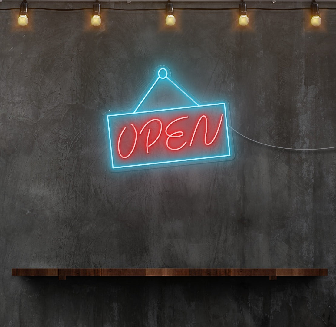 Create a dynamic and playful entrance with the Open hanging neon sign. This customisable neon light takes the classic Open sign to new heights with a hanging design that adds a touch of whimsy. Hang it in your storefront, entrance, or business space, and let the Open hanging neon sign become a captivating and lively feature.