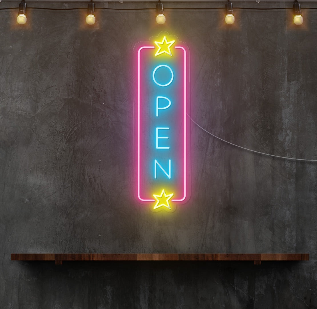 Make a celestial statement with the Open with Stars neon sign. This customisable neon light combines the classic Open sign with a touch of cosmic magic. Hang it in your storefront, entrance, or business space, and let the Open with Stars neon sign become a radiant and enchanting feature. With its celestial design and luminous glow, Open with Stars adds a touch of magic to your business, turning every moment into an opportunity to captivate and charm.