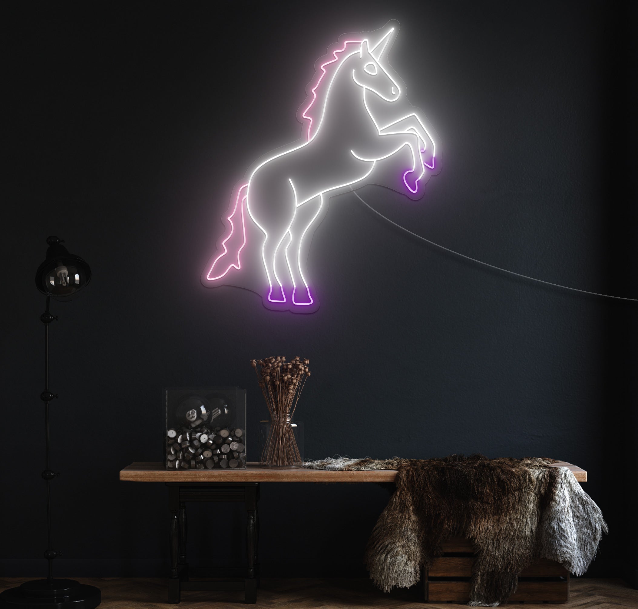 Illuminate your space with a touch of magic using the “Unicorn” LED Neon Sign. Perfect for adding a whimsical and enchanting element to any room, this neon sign showcases a stunning unicorn design that captures attention and sparks imagination. Ideal for kids' rooms, play areas, or themed parties, the “Unicorn” LED Neon Sign brings a playful and vibrant glow that transforms any environment into a fairy-tale setting.