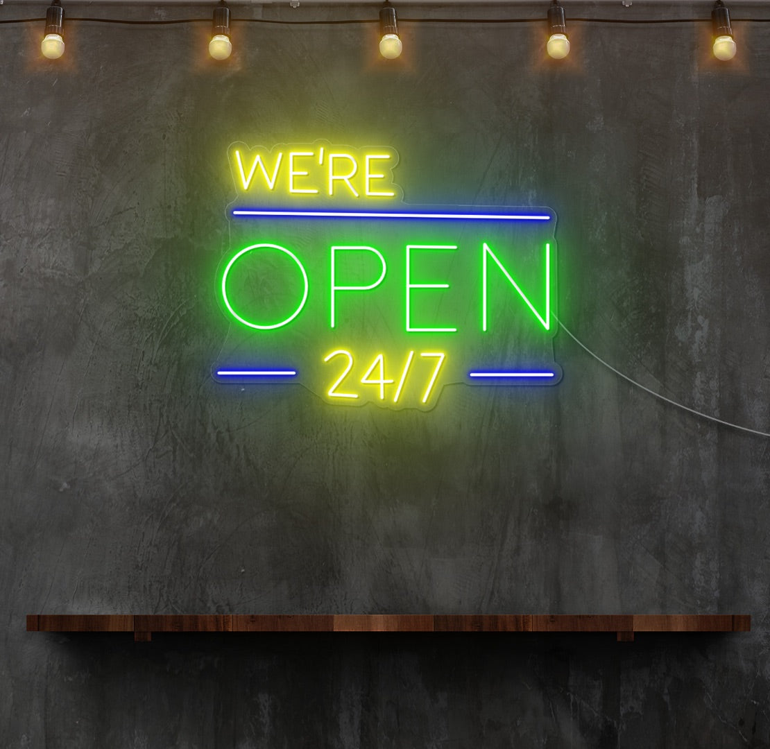 Announce your accessibility around the clock with the We're Open 24/7 neon sign. This customisable neon light boldly declares your business's continuous availability, creating a commanding and reassuring display. Hang it in your storefront, entrance, or business space, and let the We're Open 24/7 neon sign become a prominent and eye-catching feature.