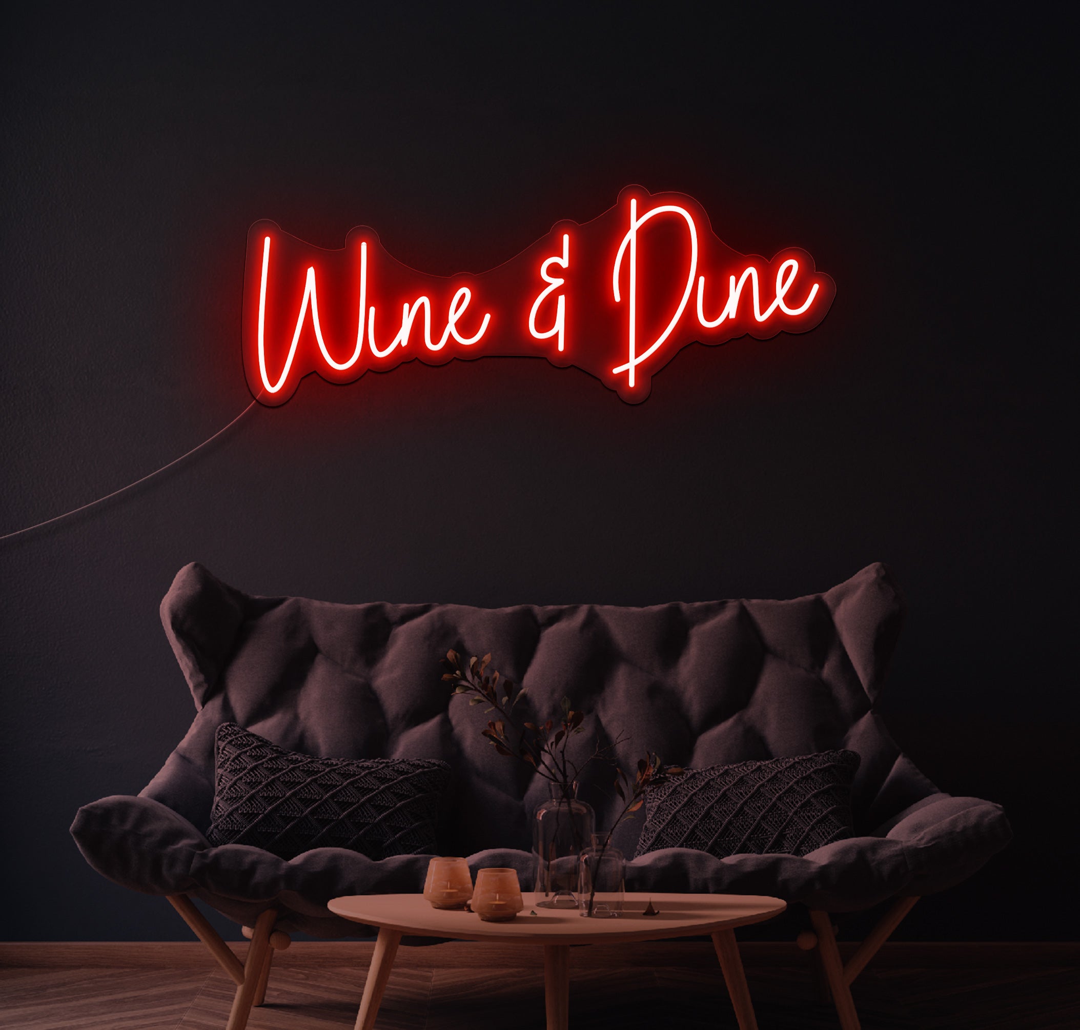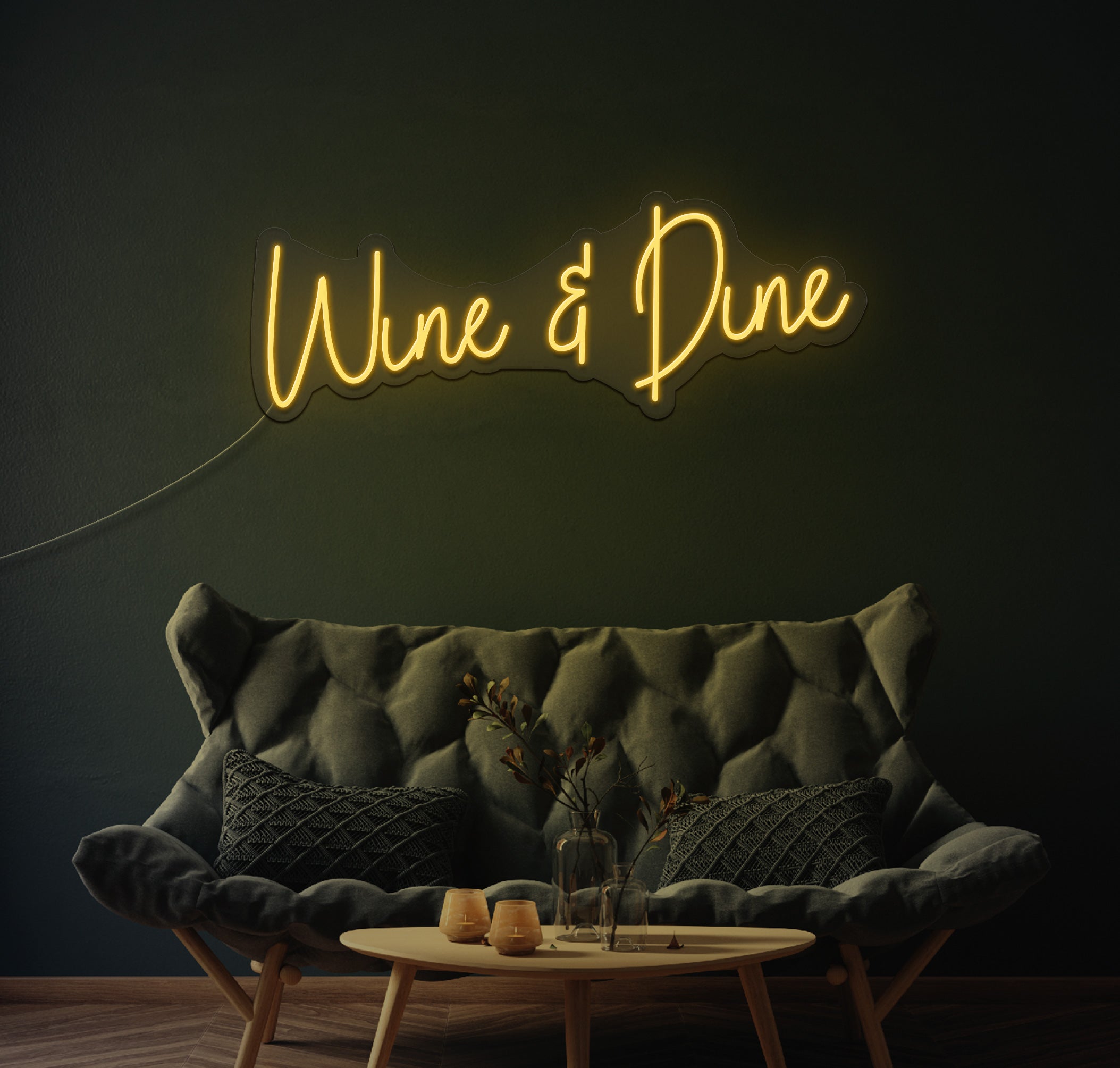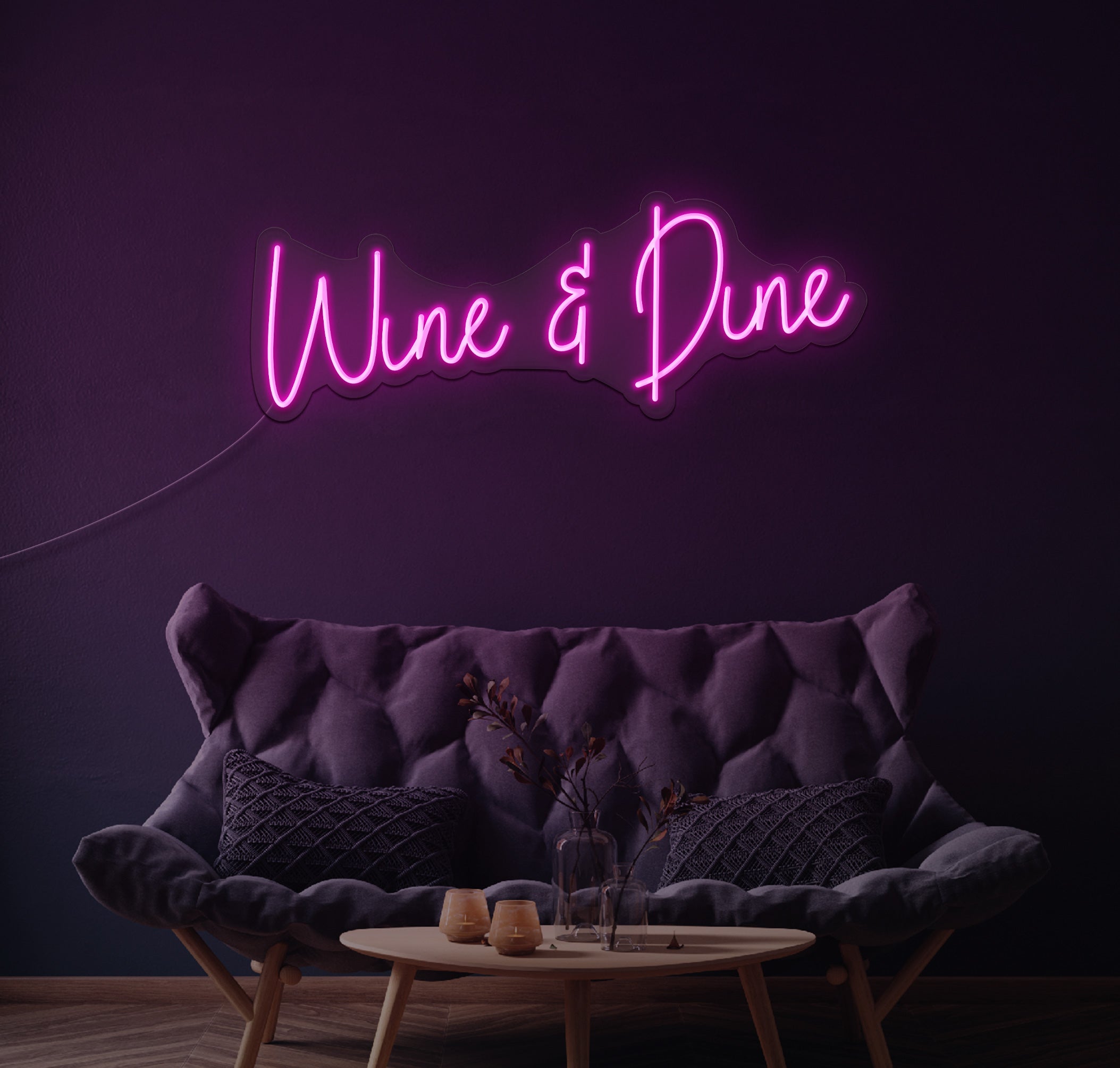 Transform your dining space with the "Wine and Dine LED Neon Sign," a perfect blend of elegance and modernity. Ideal for kitchens, dining rooms, bars, or restaurants, this vibrant neon light creates an inviting atmosphere for any gathering or special occasion. The "Wine and Dine" text is beautifully crafted in stunning LED neon, making it a focal point that enhances your decor.
